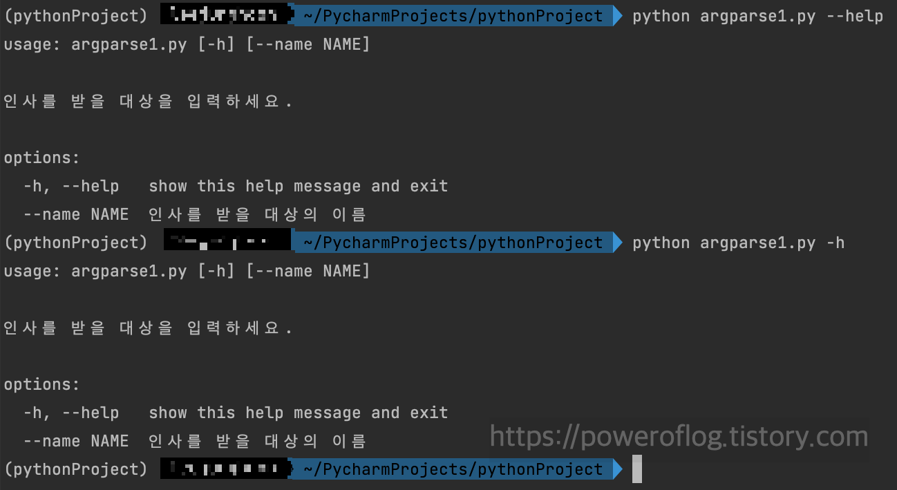 또한, description, help에 입력하였던 문구들을 확인하기 위해선 실행 시, --help 혹은 -h를 같이 입력해주면 된다.