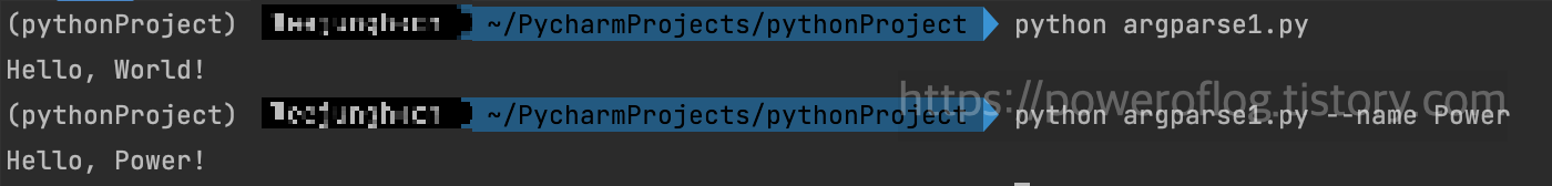Terminal에서 다음과 같이 실행 시, 아래와 같이 결과값을 확인할 수 있다. 먼저, 위 코드 상 default="World" 로 되어있기에,